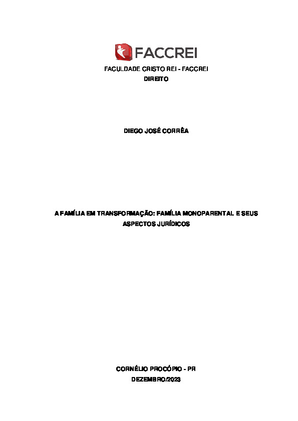 A família monoparental é a temática deste artigo, instituição essa que se origina das situações de viuvez, divórcio, adoção abandono familiar por um dos ascendentes, dentre outras situações,...